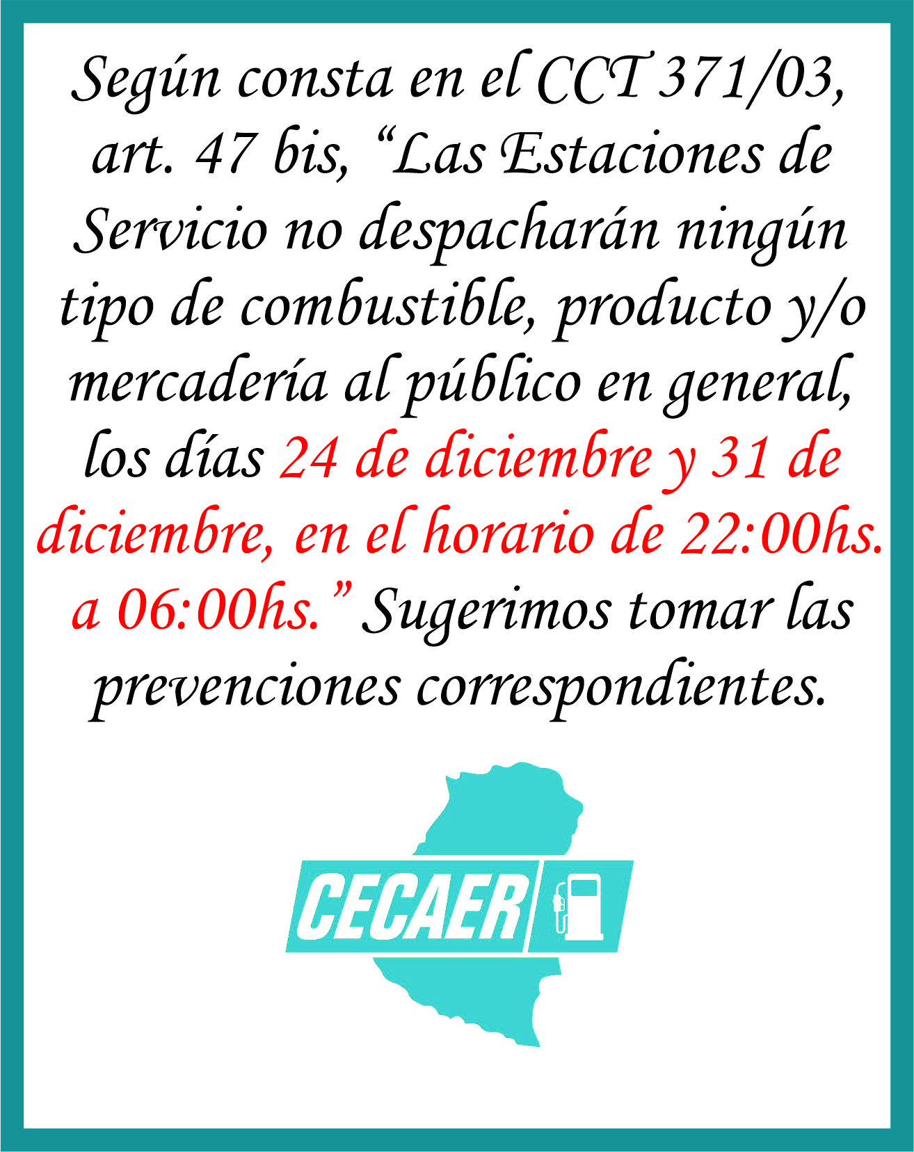 La Confederación de Entidades del Comercio de Hidrocarburos y Afines de la República Argentina (CECHA) comunicó el cronograma de funcionamiento especial que regirá para las estaciones de servicio de todo el país durante las celebraciones de Navidad y Año Nuevo.