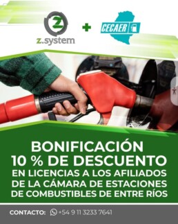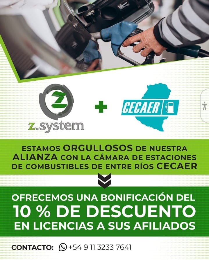 Informamos que, a partir del 1° de diciembre, se ha cerrado un acuerdo entre la Empresa z.system y CECAER, por el que la primera bonificará con un 10% de descuento sobre tarifas vigentes, a todas aquellas EESS que deseen contratar sus servicios y certifiquen estar asociadas a esta Cámara.